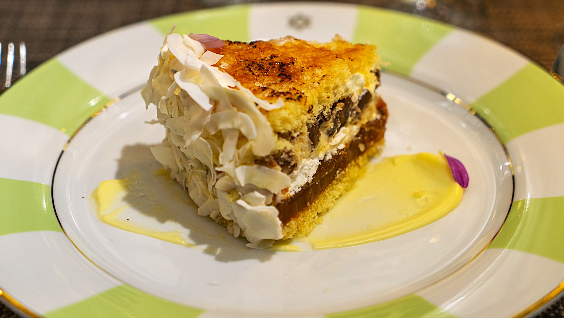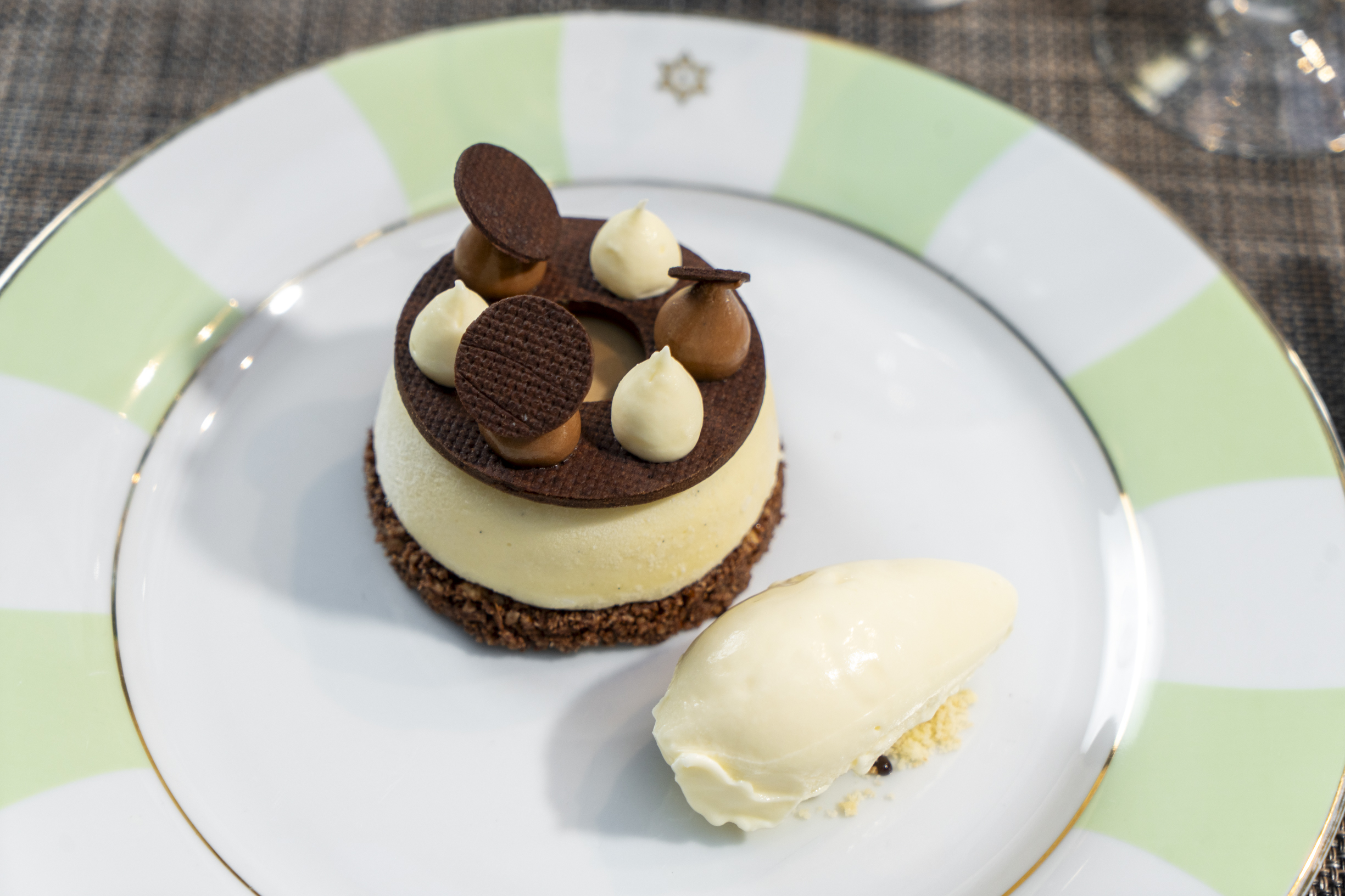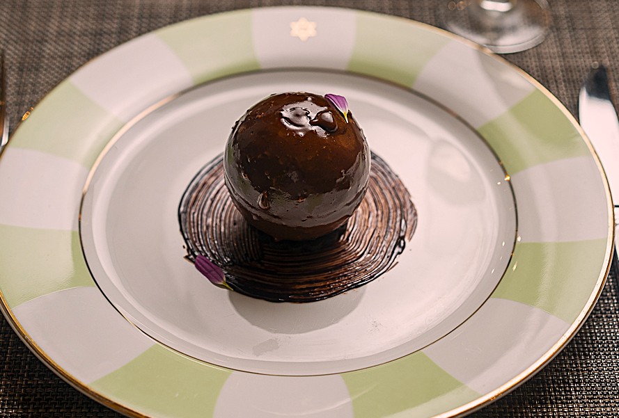 Sablee de cacao, melaka de chocolate con leche, domo de dulce de leche